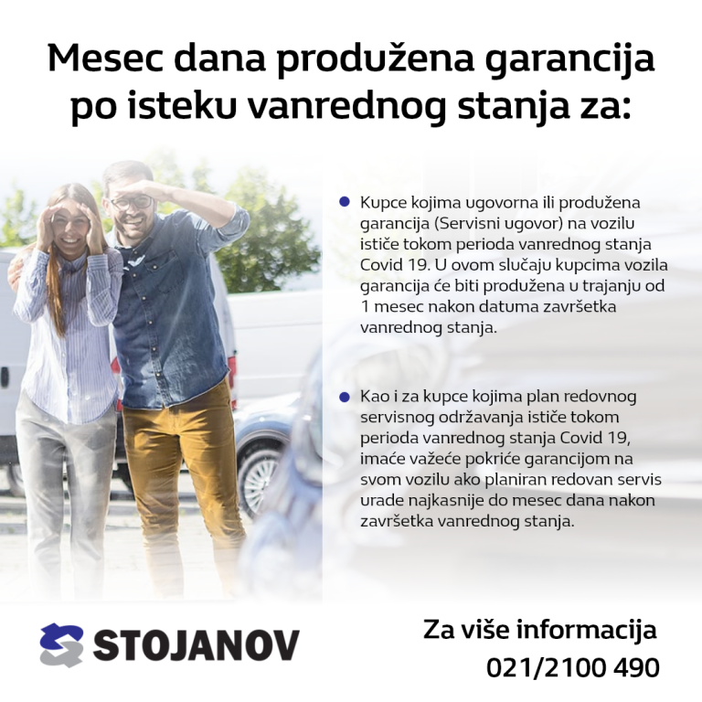 Kupci kojima plan redovnog servinog održavanja ističe tokom perioda vanrednog stanja Covid 19, imaće važeće pokriće garancijom na svom vozilu ako planiran redovan servis urade najkasnije  do mesec dana nakon završetka vanrednog stanja.