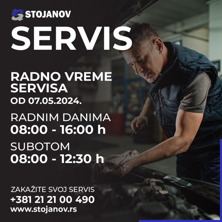 Novo radno vreme servisa 26/04/2024 Poštovani klijenti,obaveštavamo vas da je od 07.05.2024. novo radno vreme našeg servisa radnim danima od 08-16h , a subotom od 08- 12:30h.Radno vreme salona ostaje nepromenjeno .
